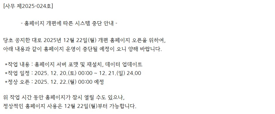 [사무국] 홈페이지 개편에 따른 시스템 중단 안내
